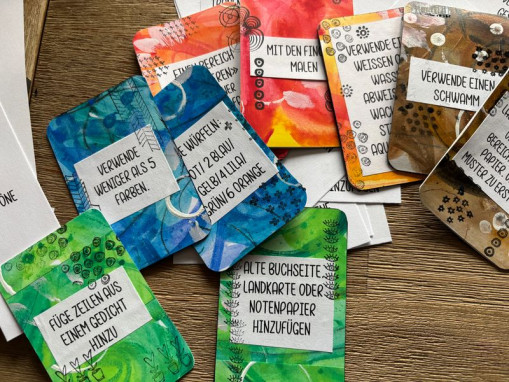 Du lernst eine spielerische, klar strukturierte Methode kennen, um mit Hilfe von Impulskarten Mixed-Media-Bilder zu gestalten. Du ziehst Karten aus Kategorien wie Medium, Technik, Farbe oder Form und kombinierst sie zu einer eigenen Bildidee. Vormittags erprobst du die Methode selbst, nachmittags gestaltest du dein individuelles Kartenset für dich und deinen Unterricht.